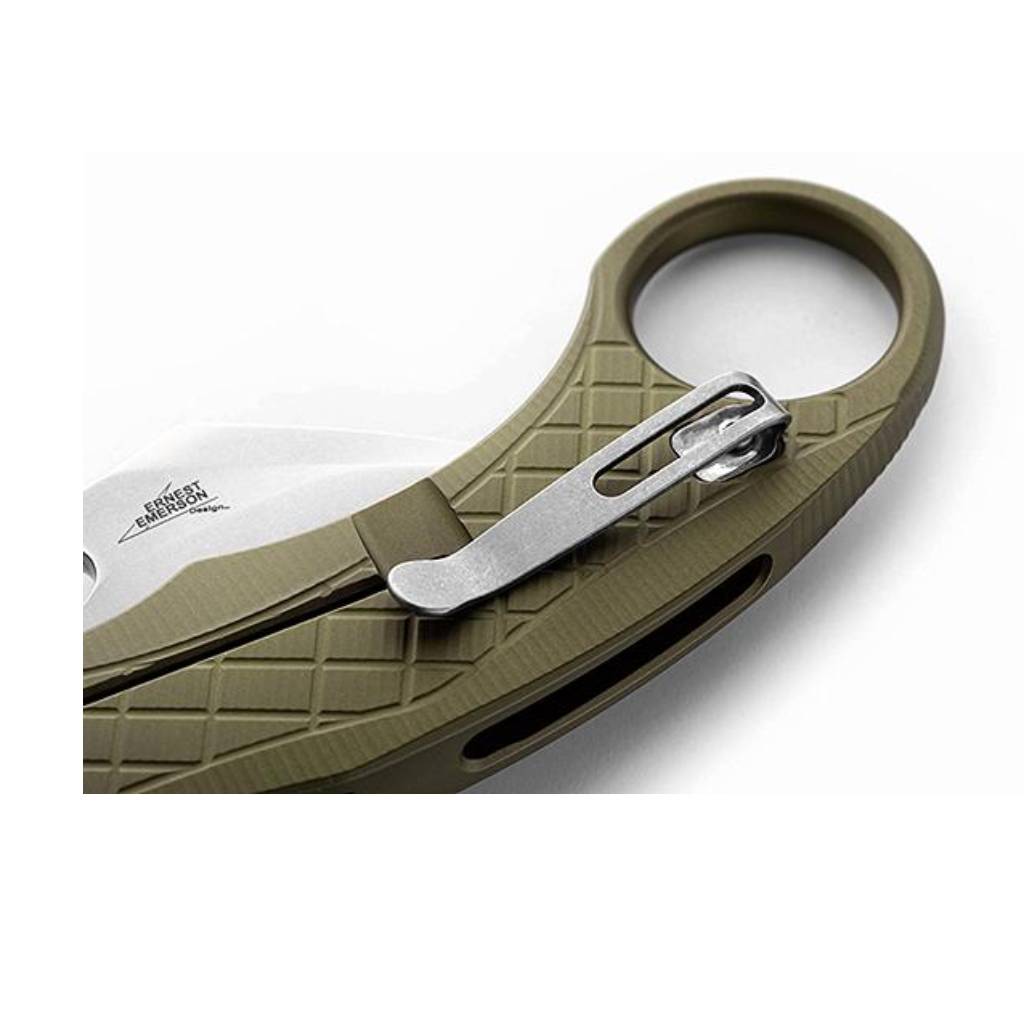 Other embedded features make the knife more comfortable and secure to be used, allow the final user to choose how to use the knife. REF (REmovable Flipper system): this feature permits to choose how to use the knife, if you don’t want the flipper you can unscrew it using the torx tool and put the second “cap” screw that perfectly fits the hole in bottom of the blade. The patented Wave Feature. Ernest Emerson created the Emerson Wave Feature when he discovered that the knife would self deploy when being pulled from your pocket, given the right motion.This device allows you to open the knife literally, as it is removed from the pocket. This makes any Emerson Knife with the remote pocket opening system the fastest deploying knife in the world. Faster than an automatic, your knife is open as it comes up into your hand-ready for use.