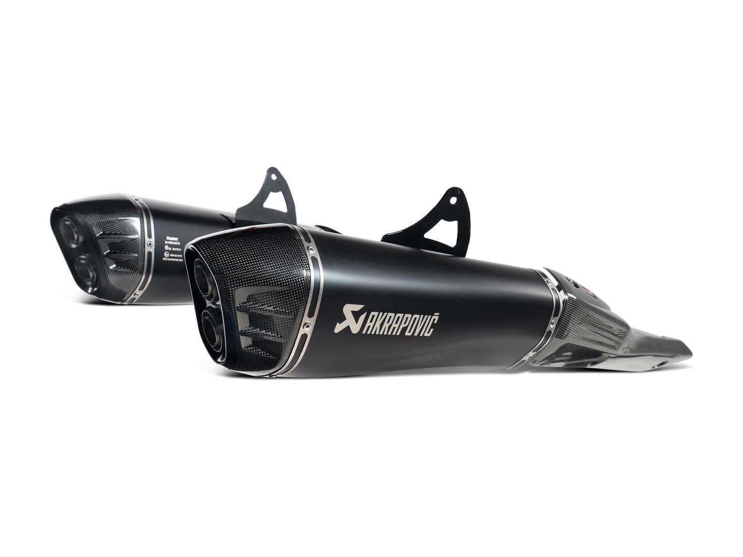 Two innovative and aero-efficient mufflers – with a catalytic converter in each to fully comply with Euro 5 EC/ECE type approval – perfectly match the design of the bike. Constructed from a black-coated lightweight titanium outer sleeve on the mufflers and high-grade stainless steel link pipes, along with carbon-fibre end caps and carbon-fibre heat shields, the exhaust weighs in at 31.6% lighter than stock.