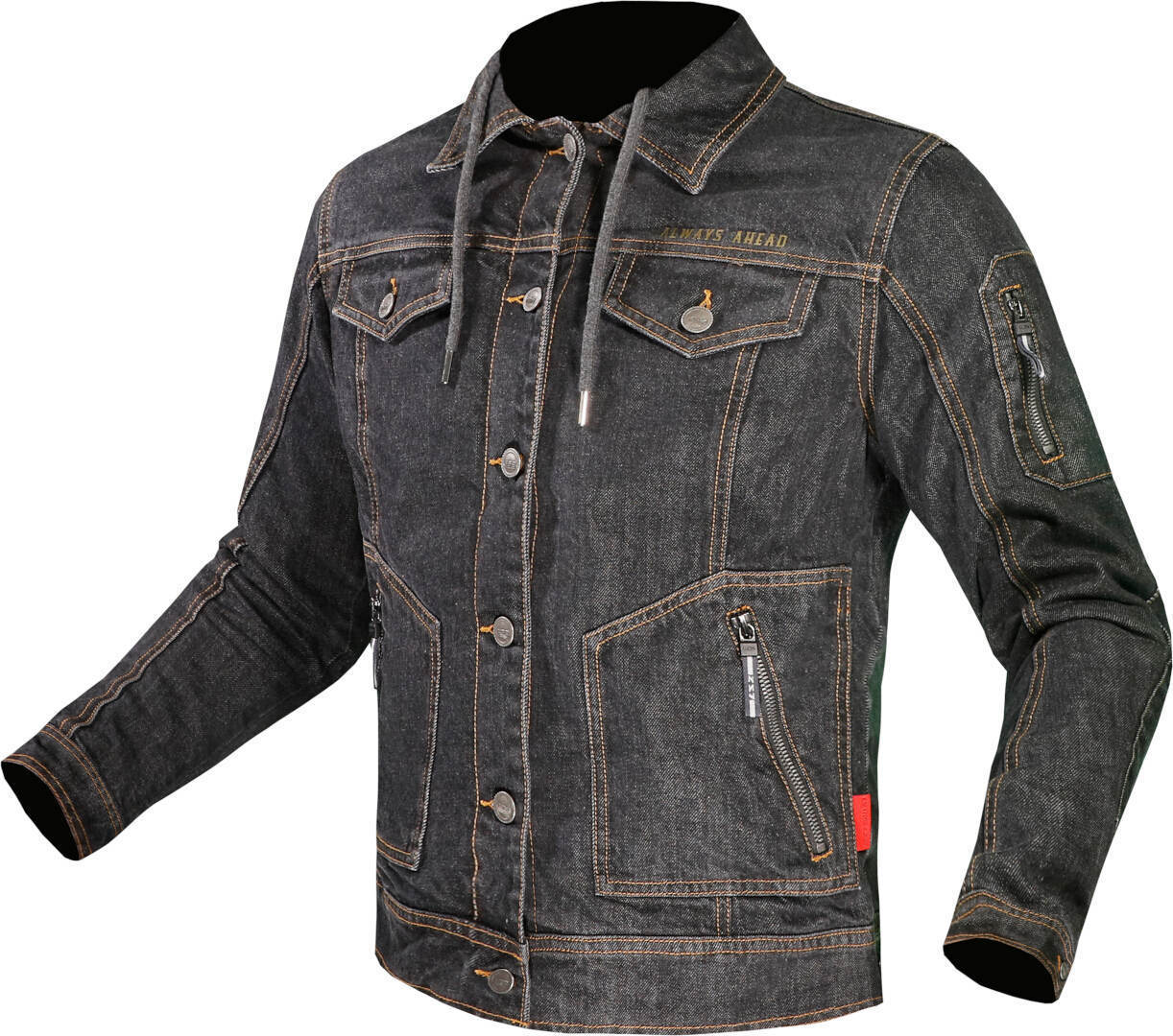 Urban denim jacket with detachable cotton hood. Double closure, with zipper and buttons, for ventilation and secure fit. Removable protectors on elbows and shoulders.