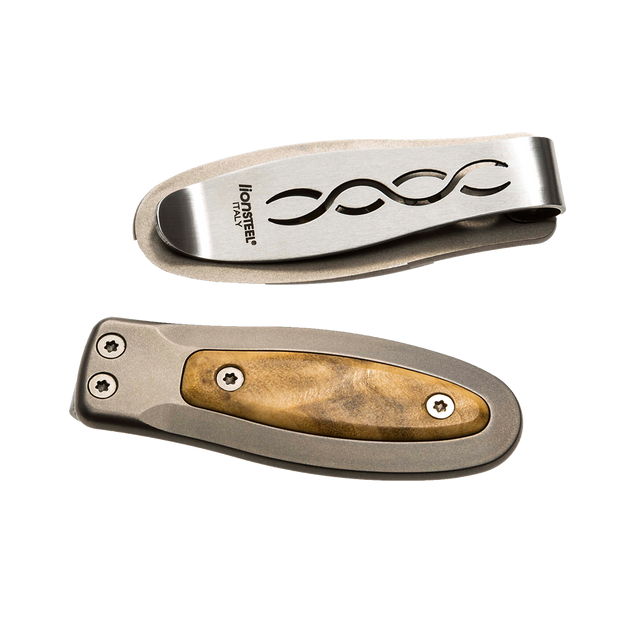 Money Clip is an elegant and strong tool to carry money. Its frame is made of 6AI4V titanium and it is provided with a stainless hardened steel clip. The inserts on the frame are availble in five precious materials: ram horn, carbon fiber, pearl, brierwood and olive wood.