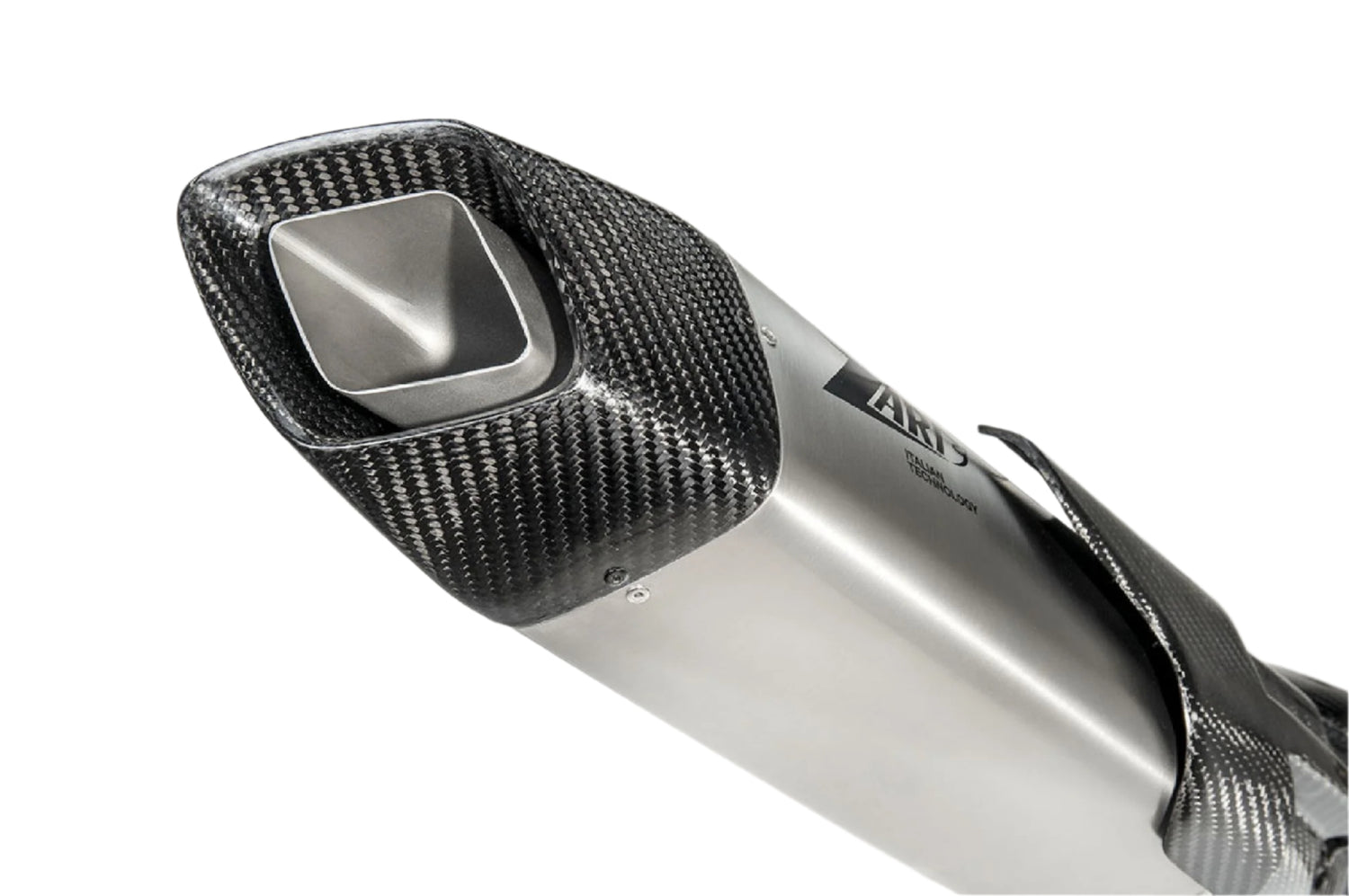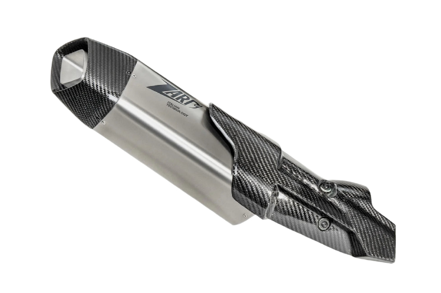 The result of the collaboration between the R&D department and the Zard Style Center, the line is composed of a silencer in a Euro 5 approved version and a racing version in titanium, both equipped with a carbon fiber end cap and heat shield. The silencer is lightweight ( -0.8 kg for the Euro 5 approved version and -0.9 kg for the racing version compared to the standard silencer) and helps increase engine performance ( +1.8 hp for the approved version and +2.5 hp for the racing version compared to the standard silencer), giving the bike the distinctive Zard sound.